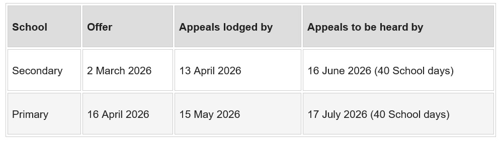 School admission appeals timetable