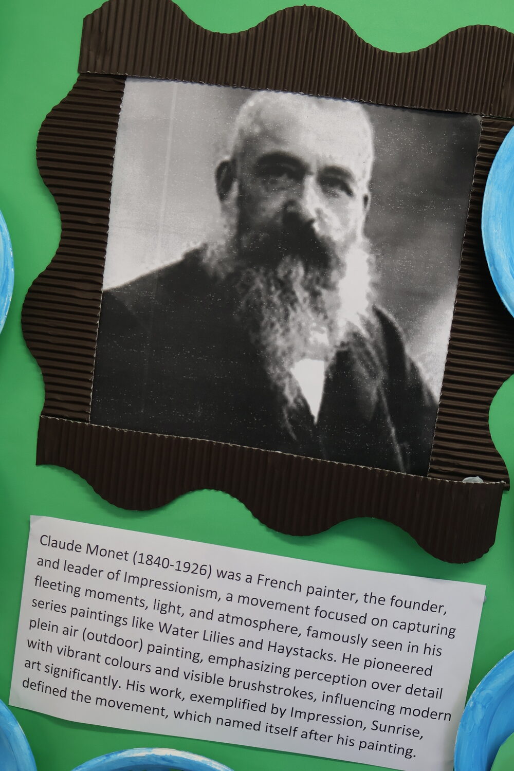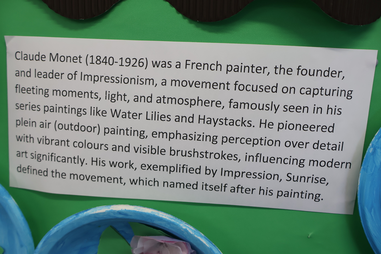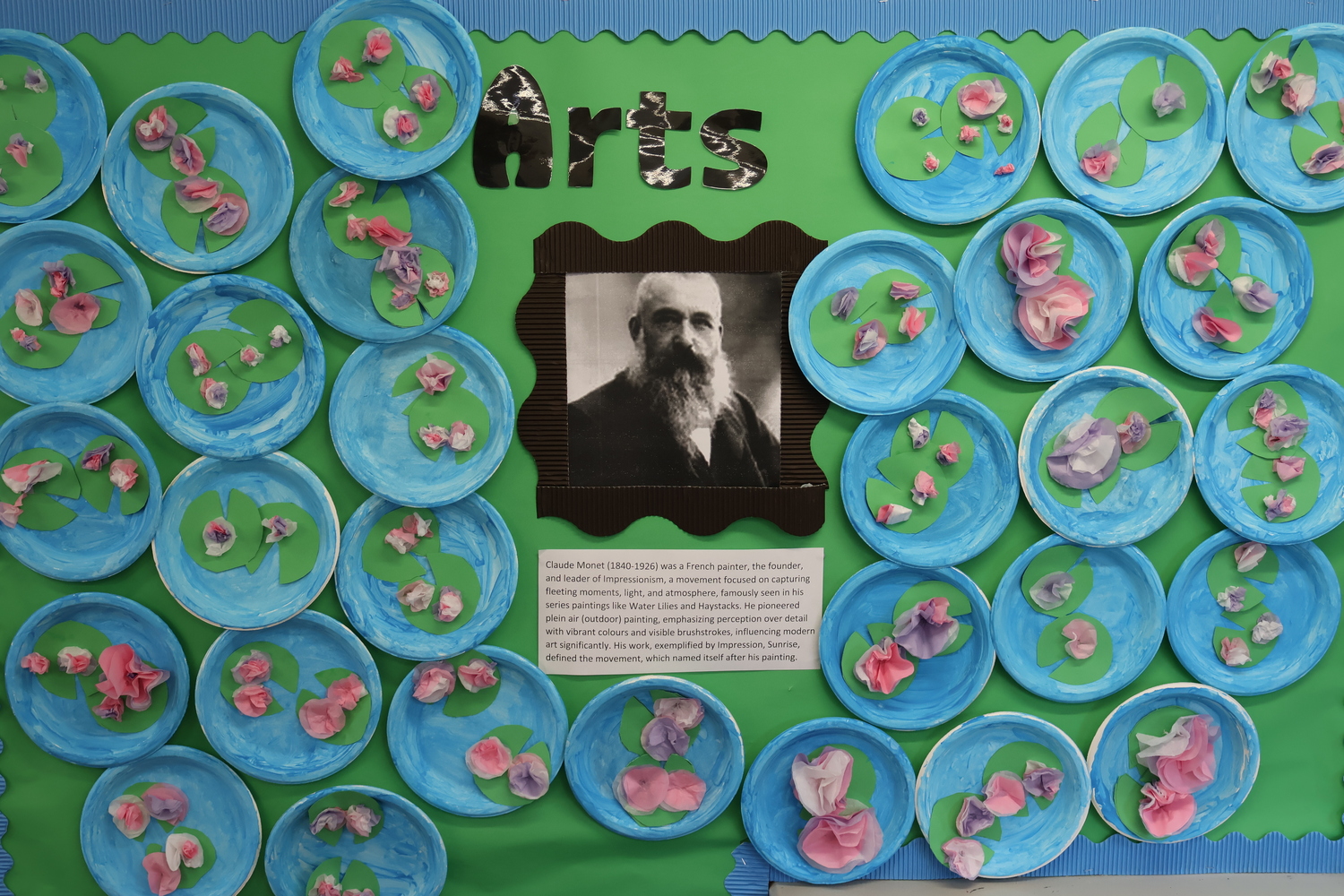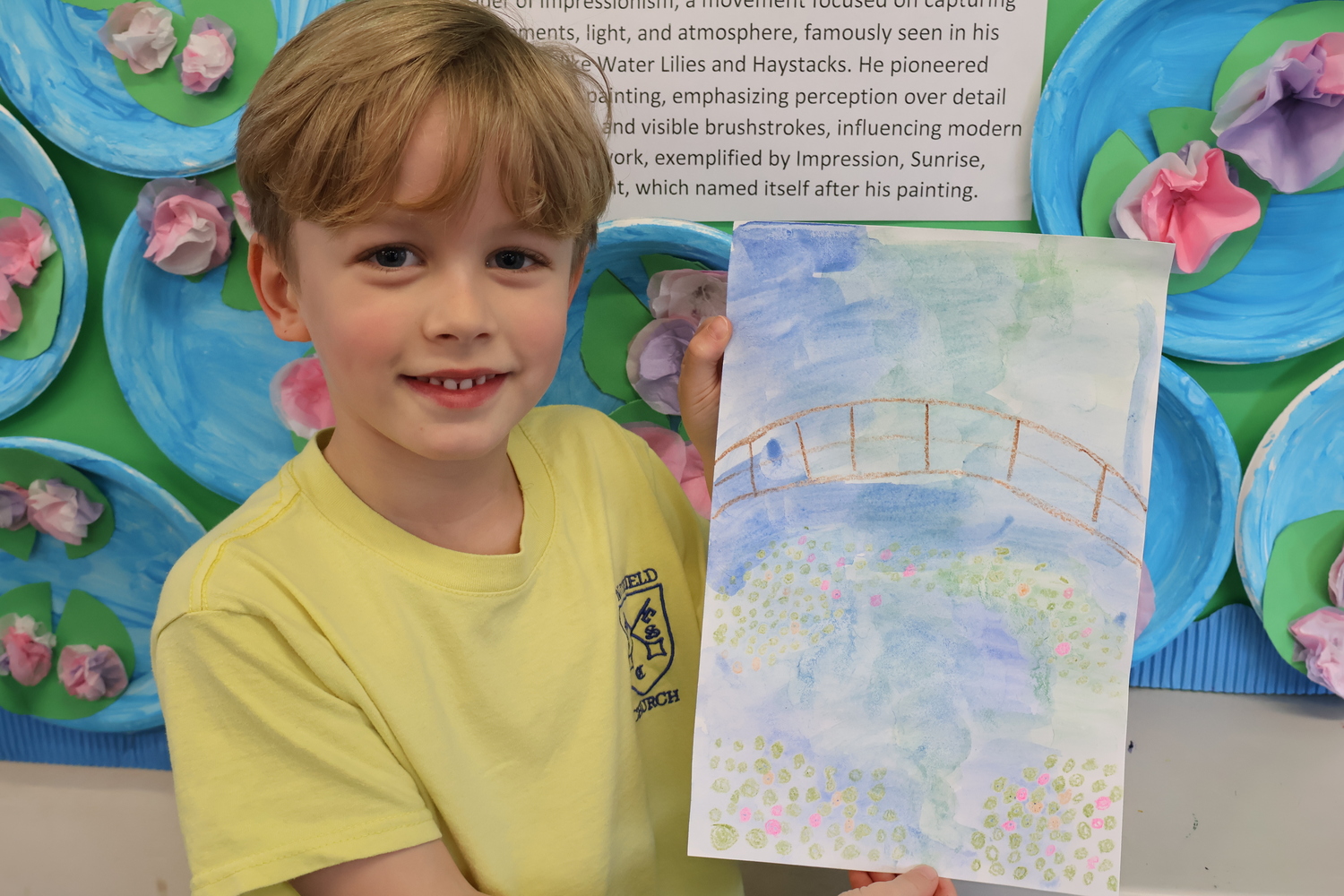 Pictured below is sections of our Monet Art Display in the classroom and one of our amazing impressionists with his own variation of this famous work of art.